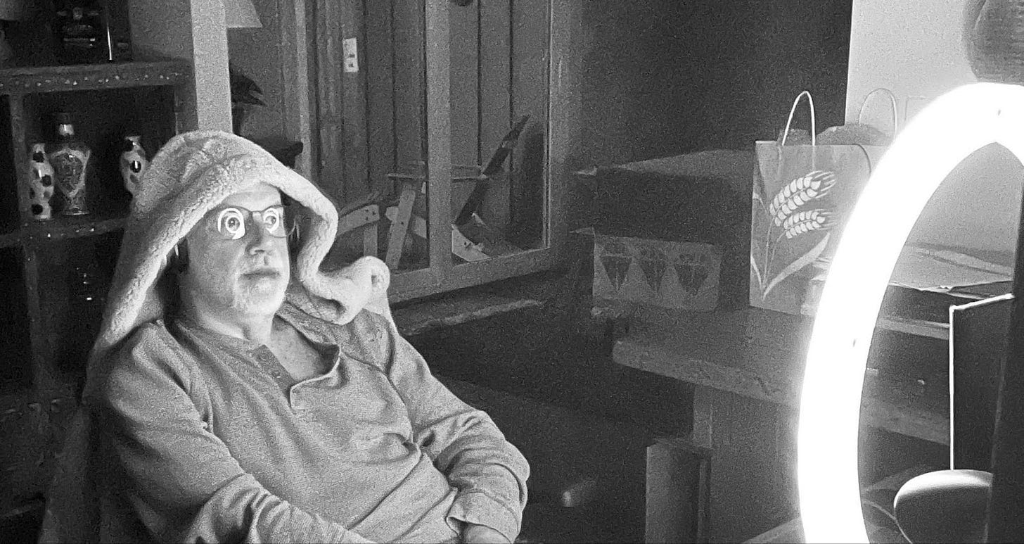 Now, on another note, Wendy took this picture of me while I was hypnotized by my lights this morning, while bundled up in my new LL Bean fleece hooded wrap!