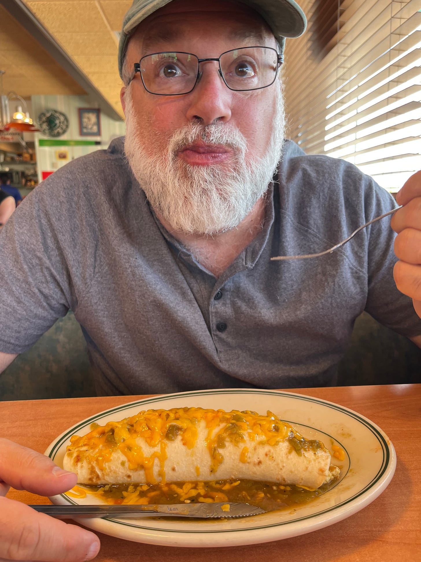 A normal day for me involves driving around the greater Phoenix area for my job. I spend a lot of time in the car, so it makes sense that I receive news of all kinds while driving. On one day this summer, the date I cannot remember, I got a call and my dad’s picture popped up on the car screen. This is one of my favorite pictures, from when my dad visited me in New Mexico, we went to a restaurant to eat green chile burrito’s. The picture is of my dad, happy as can be, with an empty fork, full mouth and a look that says, “Fuck yes, green chile and my kid”